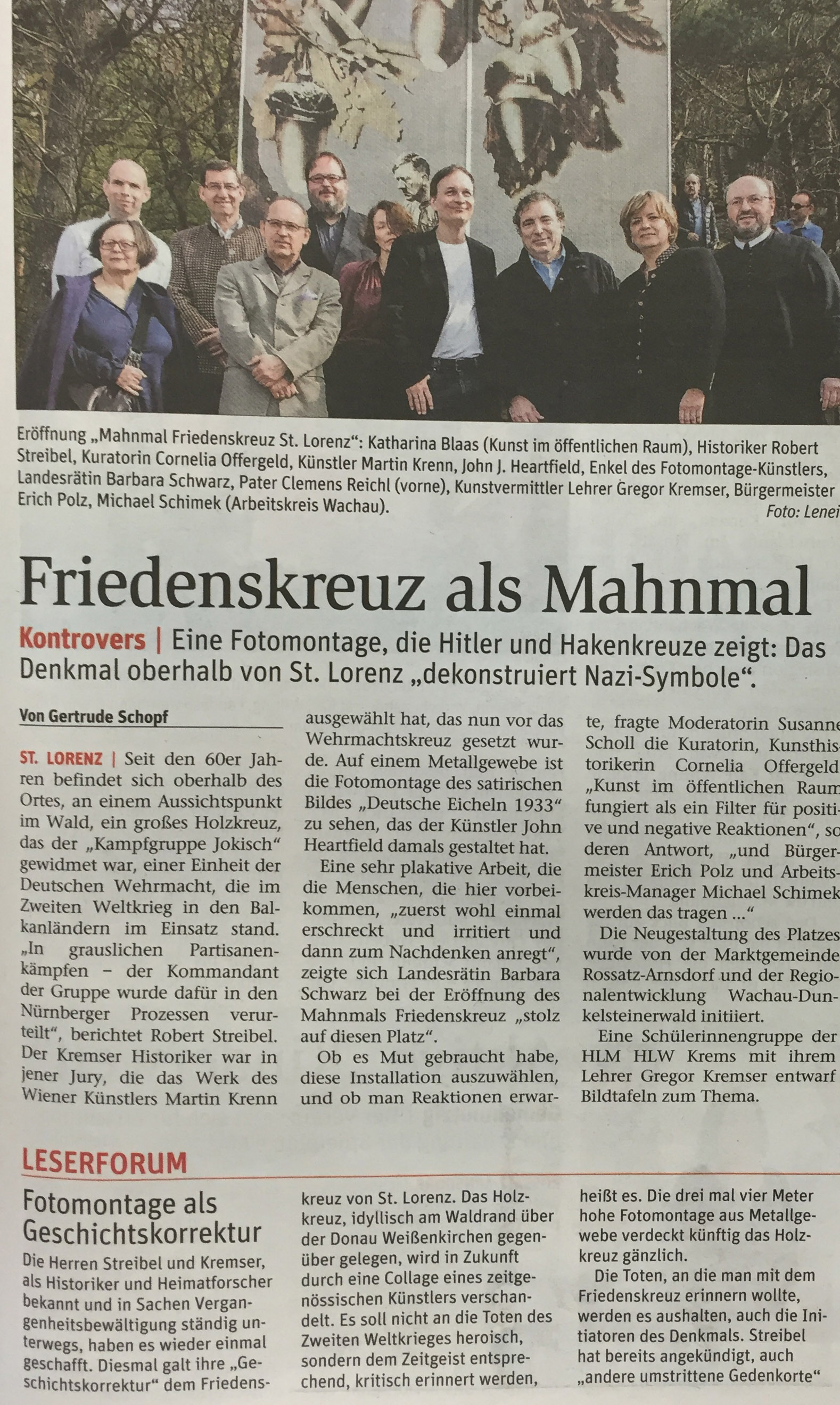am 03. April wurde das “Mahnmal Friedenskreuz St. Lorenz” von Martin Krenn eröffnet! Das Projekt von Martin Krenn ist das Ergebnis eines Wettbewerbs ausgeschrieben von der Marktgemeinde Rossatz-Arnsdorf in Zusammenarbeit mit der Wachau Dunkelsteinerwald Regionalentwicklung und dem Gutachtergremium für Kunst im öffentlichen Raum NÖ.